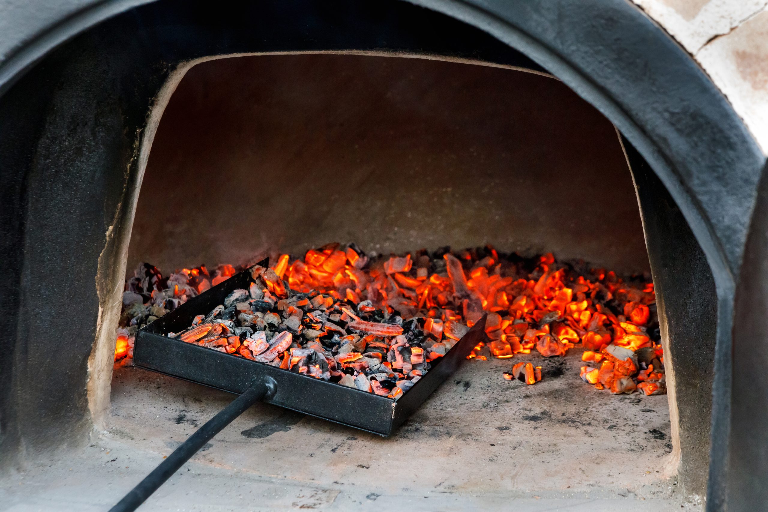 Using your metal peel or spade, move the embers to one side and allow the oven temperature to drop down to 150-200°C ready for baking.