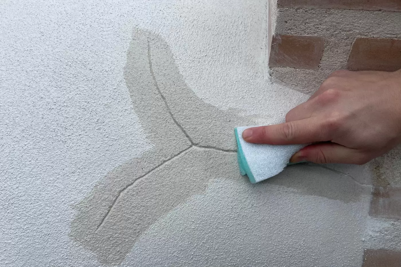 Wet the opened crack with a sponge to ensure the render mix sticks correctly.
