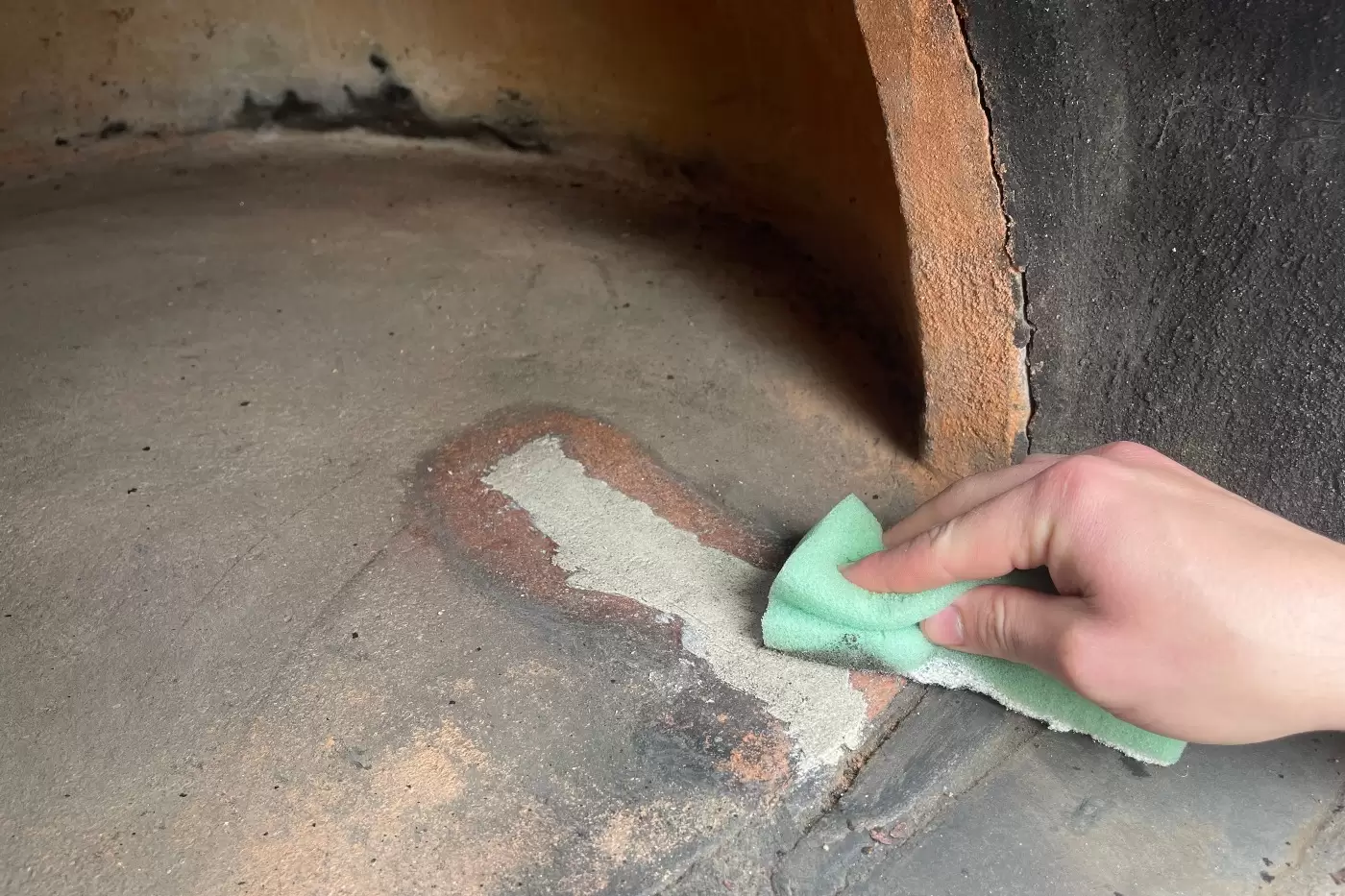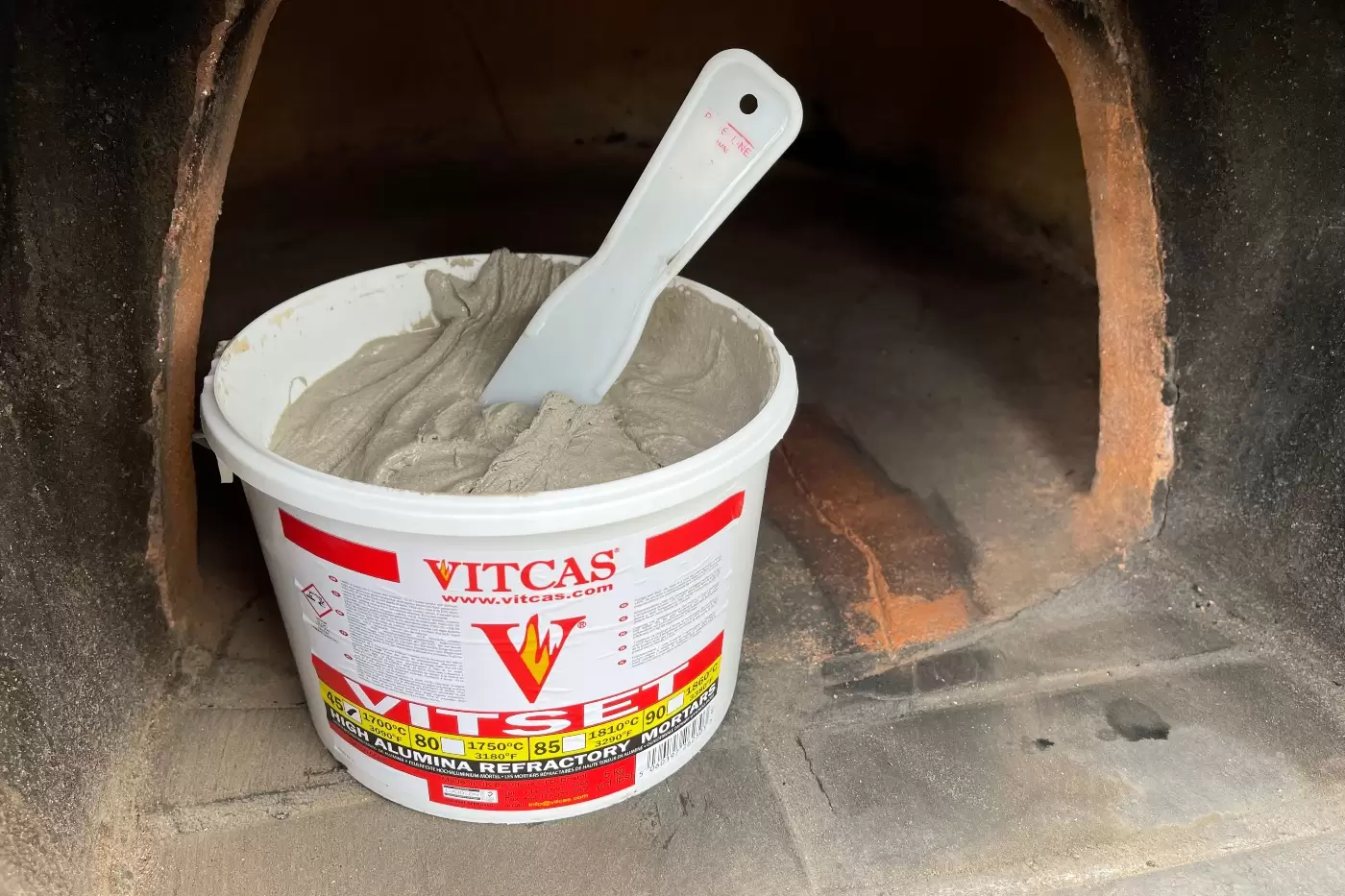 Using a spatula, fill the crack with the refractory mortar, ensuring you spread it evenly. If you have any large loose pieces of clay, spread the mortar on the open crack (recommended joint thickness is 3-5mm) and sit the piece on top, ensuring the edges are well sealed with mortar.